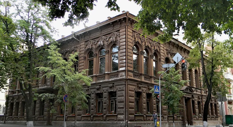 The house is a striking example of Neo-Renaissance architecture, best known for its interiors. Each room follows a different style, blending Rococo, Baroque and Art Nouveau. Inside, you’ll find the Moorish Hall, a former smoking room, the Garnet Drawing Room, the White Hall with a Venetian mirror, and a space with original stained-glass windows featuring irises. Over the years, the building served as a residence for high-ranking officials and even as a Wedding Palace. It is also part of the Kyiv Picture Gallery, and before the full-scale invasion it regularly hosted exhibitions of painting and sculpture.